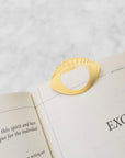 Fijado a cartulina con estampado dorado.